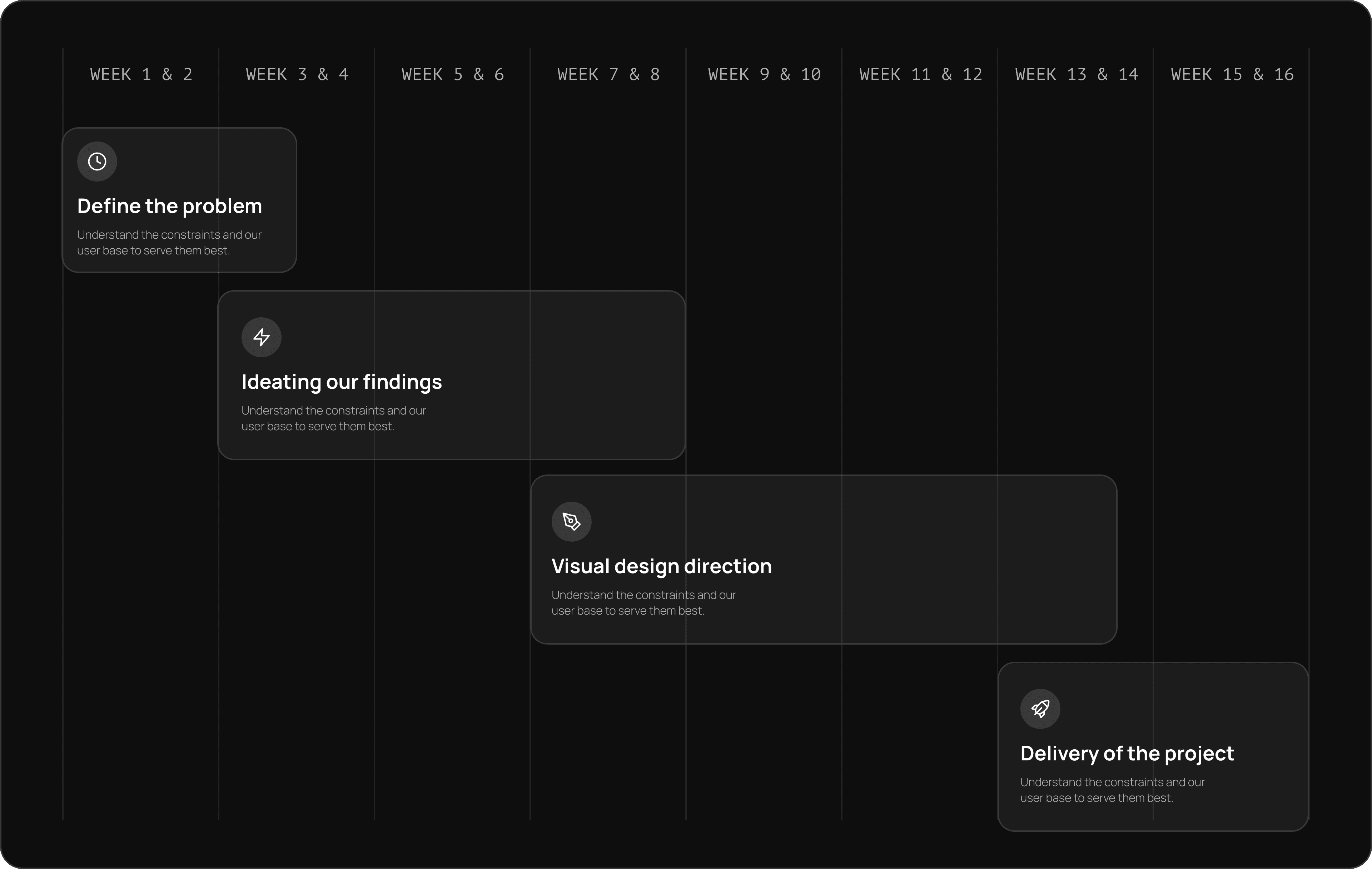 Continue with ideation until you can identify emerging experience concepts. We test concepts with users to gauge the level of acceptance.