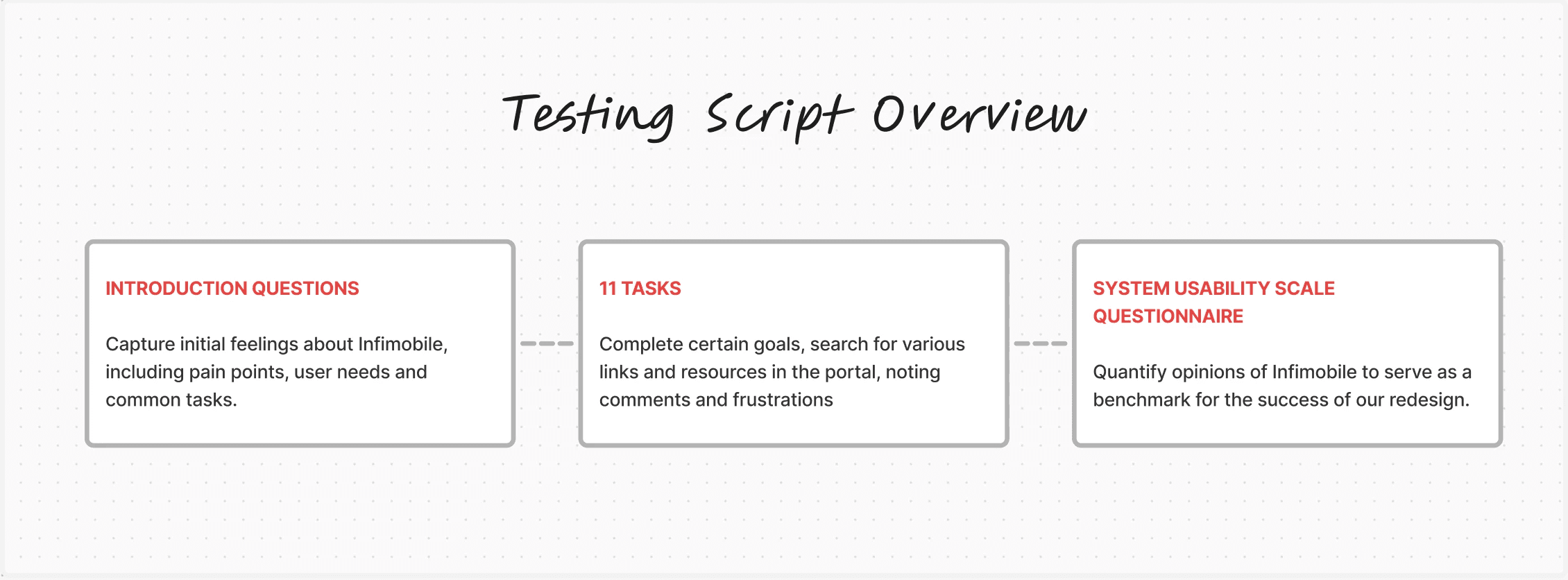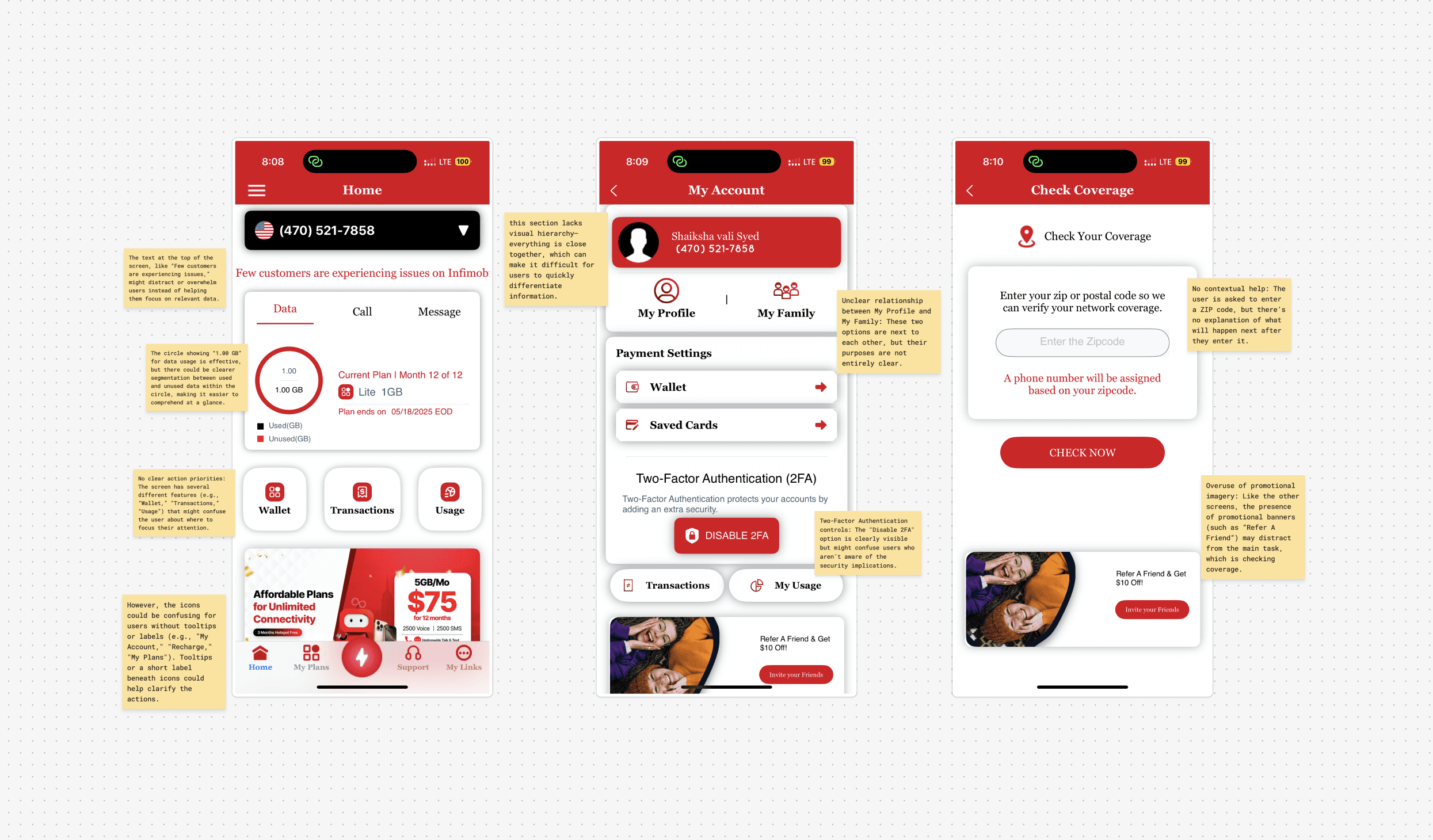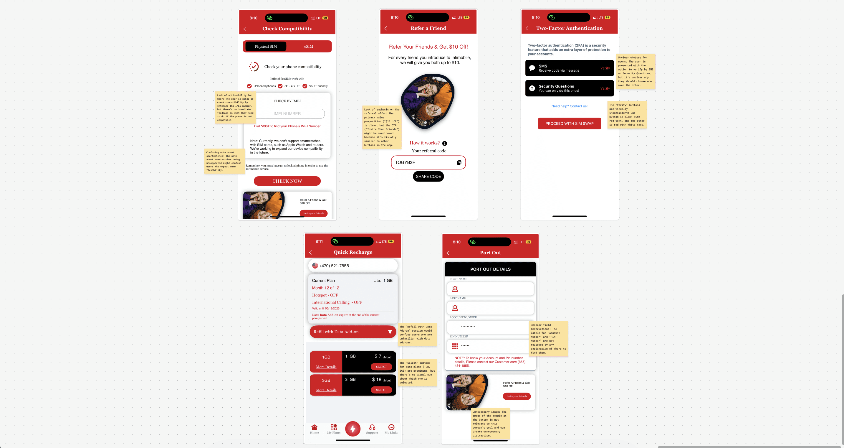 All 6 of our candidates went through the same 30 minute user test, where we asked them to complete specific tasks and locate links across Infimobile. The results were below average, and it showed that we had our work cut out for us.
